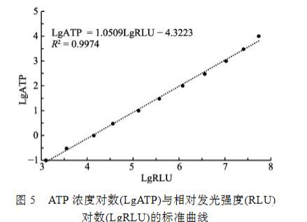 圖5 ATP濃度對數(shù)(LgATP)與相對發(fā)光強度(RLU)對數(shù)(LgRLU)的標準曲線
