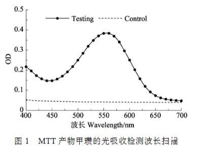 圖1 MTT產(chǎn)物甲瓚的光吸收檢測波長掃描