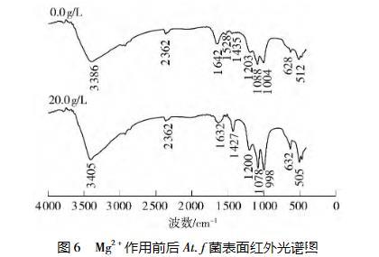 Mg2?作用前后的細菌經冷凍干燥處理后可進行紅外光譜掃描,通過對比作用前后細菌表面官能團的變化情況,能夠定性得出Mg2?對細菌的作用。At.f菌在0.0、20.0 g/L Mg2?中培養后細菌表面的紅外光譜圖見圖6。