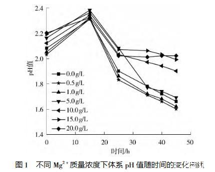 細菌氧化過程伴隨著H?及電子的移動,從而導致pH值改變。不同Mg2?質量濃度下At.f菌培養過程中pH值隨時間的變化情況如圖1所示。