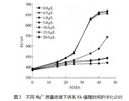 氧化還原電位能從整體上反映系統的氧化能力。不同質量濃度Mg2?下At.f菌培養過程中Eh值隨時間的變化情況如圖2所示。