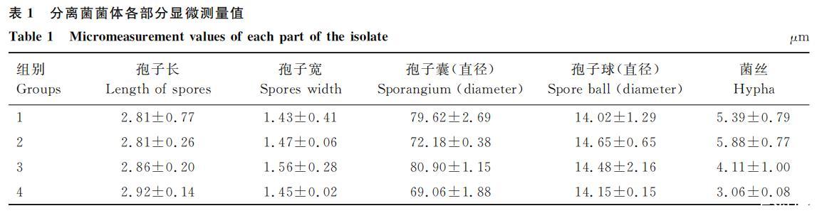 在普通光學(xué)顯微鏡下,用測微尺對分離菌的孢子囊、孢子球、孢子及菌絲進(jìn)行測量,結(jié)果如表1所示。分離菌孢子呈橢圓形,長度為2.1~3.1μm,寬度為1.4~1.7μm,差別不大,孢子球中包含數(shù)個(gè)孢子,直徑為12~16μm不等,孢子球被孢子囊包裹,孢子囊直徑在66~80μm之間,在培養(yǎng)基中可肉眼直接觀察到。菌絲直徑為3~6μm。