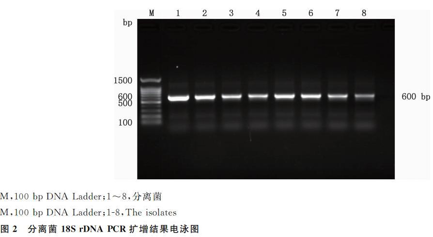 18S rDNA PCR擴(kuò)增產(chǎn)物的電泳結(jié)果見圖2。由圖2可知,在約600bp處有明亮條帶。將PCR產(chǎn)物測序結(jié)果在NCBI中進(jìn)行BLAST序列比對,結(jié)果與蜜蜂球囊菌(Ascosphaera apis,GenBank登錄號(hào):GQ867785.1)18S rDNA序列相似性最高,為100%,確定該菌種為蜜蜂球囊菌。