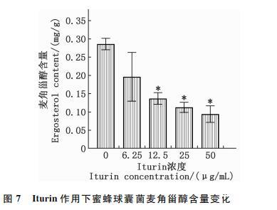由圖7可知,隨著Iturin濃度的升高,麥角甾甾醇含量逐漸降低。與對照組相比,當Iturin濃度為12.5、25和50μg/mL時,麥角甾甾醇含量分別下降了52.18%、60.69%和67.12%,差異顯著(P<0.05)。