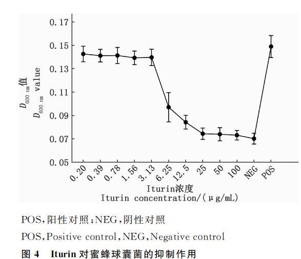 MFC試驗中陰性對照沒有蜜蜂球囊菌生長,陽性對照蜜蜂球囊菌全部生長,Iturin濃度為6.25、12.5、25μg/mL時蜜蜂球囊菌生長,Iturin濃度為50、100μg/mL時無蜜蜂球囊菌生長,Iturin對蜜蜂球囊菌的MFC是50μg/mL(表3)。