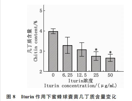 由圖8可知,與對照組相比,Iturin各濃度處理組幾丁質含量分別下降了17.39%、22.58%、30.69%和32.94%,25和50μg/mL Iturin組幾丁質含量顯著低于對照組(P<0.05)。