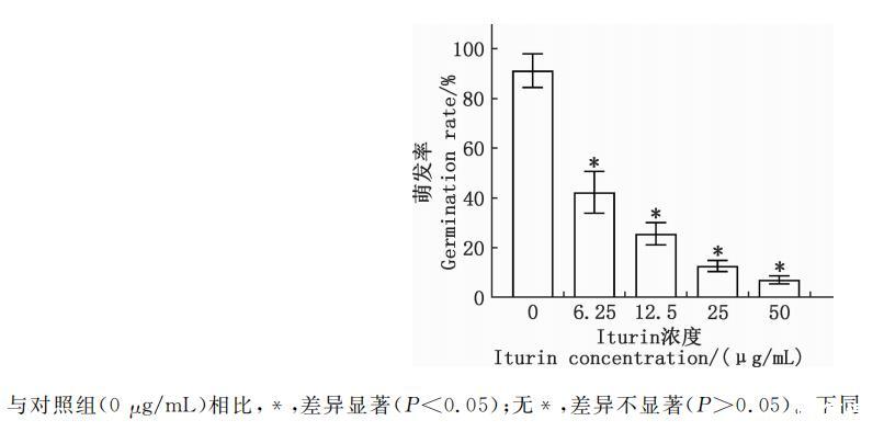 抑菌試驗結果顯示,Iturin抑菌效果呈現明顯的濃度依賴性,3.13~25μg/mL范圍內抑菌作用逐漸增強,25μg/mL時達到最大效果。孢子萌發(fā)抑制試驗證實其抑制率與濃度呈正相關(6.25~50μg/mL)。相比對其他病原菌的MIC值(鐮刀霉51.8μg/mL,灰葡萄孢霉37.0μg/mL),Iturin對蜜蜂球囊菌顯示出更強的抑制活性,表明其具有高效、廣譜的抗真菌特性。