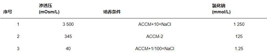 依據國外已報道的方法,分別準確配置不含Na+及Cl-的無生命培養基ACCM-2(-NaCl),以及終濃度為0.3 g/mL的氯化鈉母溶液。將氯化鈉母溶液分別以終濃度1 250 mmol/L、125 mmol/L、1.25 mmol/L加入24孔板內的ACCM-2(-NaCl)無生命培養基中,完成高滲壓組(ACCM+10×NaCl,3 500 mOsm/L)、常規組(ACCM-2,345 mOsm/L)及低滲組(ACCM+1/100×NaCl,40 mOsm/L)培養基的制備,如表1所示。分別向上述ACCM培養基中加入106拷貝的貝氏柯克斯體九里II相菌種,每組均平行重復3次實驗,后將24孔板置于2.5%O2,5%CO2,37℃的恒溫低氧培養箱中靜置培養7 d。