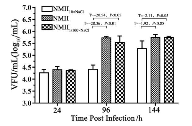 研究表明,環境野生型與實驗室培養的貝氏柯克斯體對真核細胞的感染性不同,基于無生命培養基高滲壓脫水后的菌體對真核細胞的感染性未知。因此,我們通過qPCR定量并調整NMII10×NaCl、NMII、NMII1/100×NaCl菌體拷貝一致后,利用相差顯微鏡計數高滲脫水所得菌體NMII10×NaCl感染BGMK細胞的VFU值,可見在感染后24 h高滲透壓組菌體NMII10×NaCl的VFU較常規組NMII、低滲透壓組NMII1/100×NaCl的VFU無顯著改變。在感染后96 h,NMII10×NaCl的VFU對比感染后24 h未見明顯對數增長,這與NMII及NMII1/100×NaCl在感染后96 h VFU的對數增長顯著不同。值得注意的是,在感染后144 h,NMII10×NaCl的VFU對比感染后96 h的VFU值增加,同時與NMII有統計學差異(t=-2.11,P<0.05),這提示可能與菌體經高滲脫水處理后在胞內的適應性生長有關,如圖3所示。