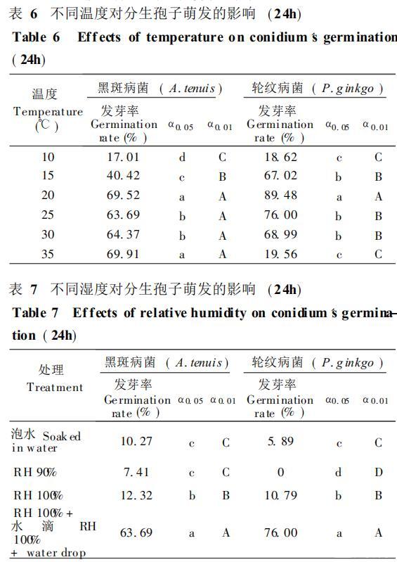 朱克恭研究認為銀杏葉枯病的病原菌中,黑斑病菌在6月~10月都有大量的出現,而輪紋病在高溫季節很少出現,僅在10月份才有所增加。本實驗得到相似的結果,輪紋病菌不能耐35℃的高溫,黑斑病菌耐高溫的能力強。2種菌在RH65%以上都生長好,適宜的相對濕度為75%~85%,試驗結果表明:相對濕度大有利于分生孢子形成;飽和濕度且有水滴的培養條件,分生孢子的發芽率最高。因此,在綜合防治中,清除銀杏果園內的雜草,降低地表面的相對濕度,可以在一定程度上減少侵染來源。泡水處理中,分生孢子的發芽率低,也許與缺氧有關。