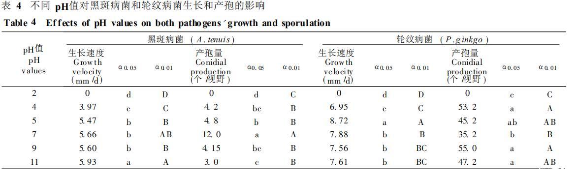 試驗結果(表4)表明,2種菌在pH值<2都不能生長,生長和產孢pH值范圍為4~11,并且以pH值5~11基質中生長為好。黑斑病菌在pH值為11的基質中生長快,但此時菌落稀疏,產孢量較少;pH值為7時,該菌生長速度僅次于pH值11,且菌絲濃密,產孢量最大;在pH值4~5和pH值9~11范圍內的產孢量沒有達到極顯著水平。輪紋病菌在pH值4~9基質中形成同心環型菌落,其中以pH值為5的基質上生長最好,氣生菌絲發達,菌落濃密,pH值為4和pH值為9的產孢量最大,兩處理間的產孢量沒有顯著性差異。