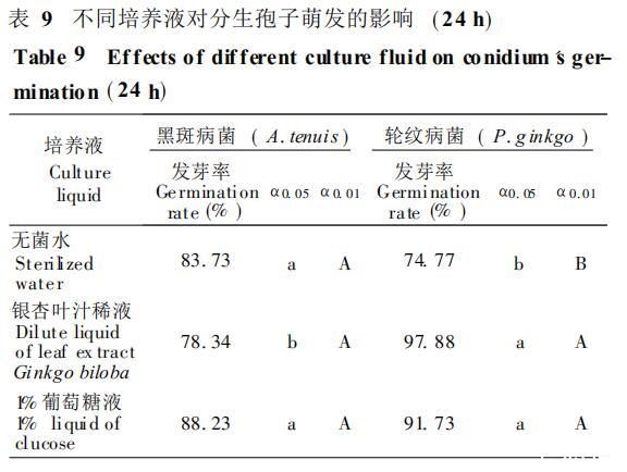 從表9可看出,黑斑病菌的分生孢子24h的發芽率在α?.??水平上沒有顯著性差異,說明該菌分生孢子萌發與培養液有無養分沒有顯著關系。而輪紋病菌的分生孢子在銀杏葉汁稀液和1%葡萄糖液中的萌發率高,且不存在顯著性差異;但與在無菌水中萌發比較就存在顯著性差異。