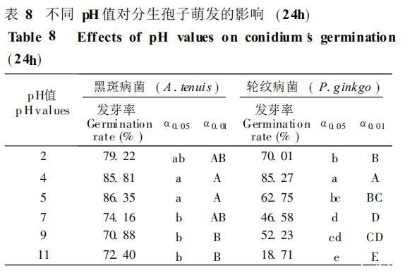 從表8可看出,2種菌的分生孢子在pH值2~11都能萌發。黑斑病菌的分生孢子萌發適宜pH值為2~7,最適pH值為4~5;輪紋病菌的孢子在pH值2~5范圍萌發較好,最適為pH值4。由此可見,偏酸性的環境有利于黑斑病菌和輪紋病菌的分生孢子萌發,尤其是后者。