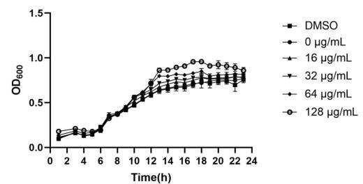 結果表明:在有效濃度范圍內(16-128μg/mL),龍腦均不影響沙門氏菌SL1344的生長(見附圖)。