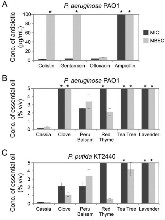 圖3選定抗生素和抗菌精油對銅綠假單胞菌PAO1(A,B)和粘細菌KT2440(C)的活性。通過挑戰細菌(無論是游離狀態還是在生物膜內)來確定各種物質的MIC和MBEC。星號表示數據超出了圖表的范圍,表明在測試濃度下沒有觀察到殺傷作用。每個實驗都進行了三次重復,誤差棒表示標準誤差。