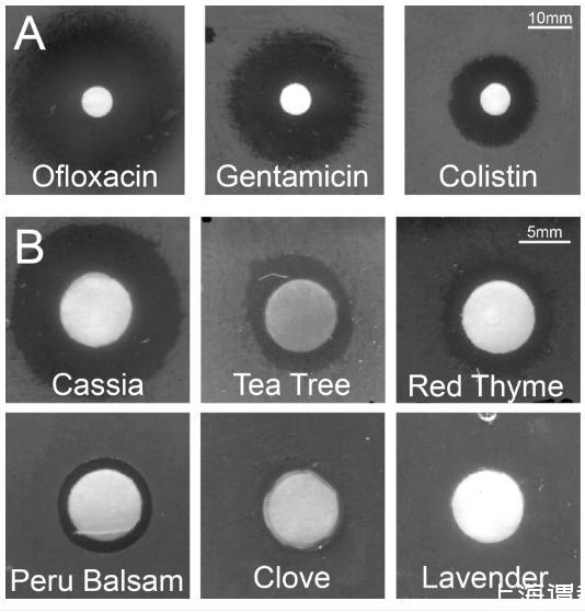 圖2擴散試驗鑒定出具有抗菌活性的精油。抗生素濃度為20 mg ml?1(A)和純精油(B)被測試對銅綠假單胞菌PAO1。產生抑制區的物質進一步分析;薰衣草油作為陰性對照。