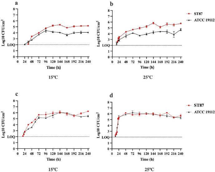 圖1.單核細胞增生李斯特菌ST87和ATCC 19112在不同溫度下TSB-YE(a,b)和DTSB-YE(c,d)形成的生物膜中的活力