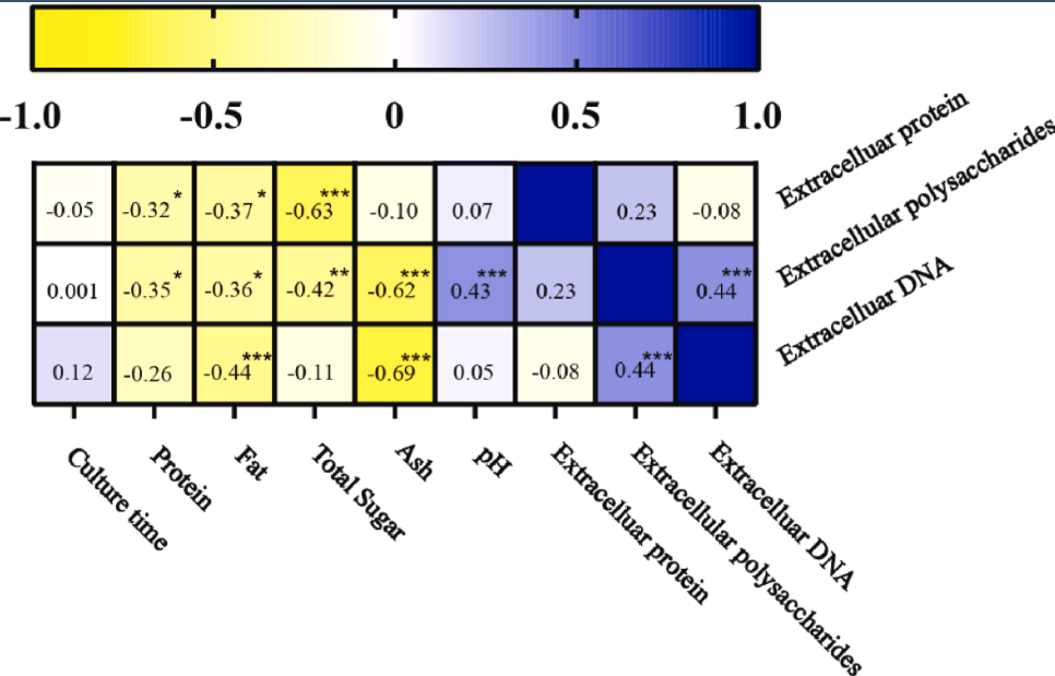 圖6.25°C下ST87生物膜中的細胞外物質與生長培養基中的營養成分之間的Spearman相關系數熱圖,以及培養時間。