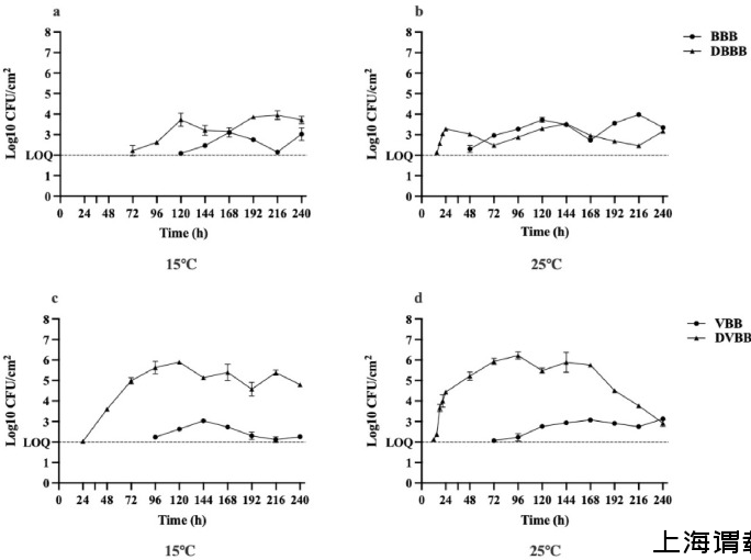 圖2.單核細胞增生李斯特菌ST87菌株在不同溫度下在牛肉(a,b)和蔬菜汁(c,d)中形成的生物膜中的活力。