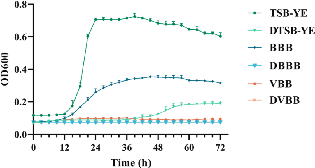 將制備的兩種單核細胞增生李斯特菌株的生物量分別加入到各培養基(TSB-YE、DTSB-YE、BBB、DBBB、VBB和DVBB)中,比例為1:10,使單核細胞增生李斯特菌密度約為103CFU/毫升。將每組接種的培養液的體積為200μL,一式三份分配到100孔蜂窩®微孔板的孔中。使用Bioscreen C(Oy Growth Curves Ab Ltd.,Helsinki,Finland)在25°C下以中等強度連續振蕩72小時,并在600nm波長(OD 600)OD下測量光密度600每2小時測量一次。將每種無菌培養物作為對照納入并用于校正OD600值。該實驗是用兩個獨立的生物學重復進行的,每個重復在三個技術上平行。