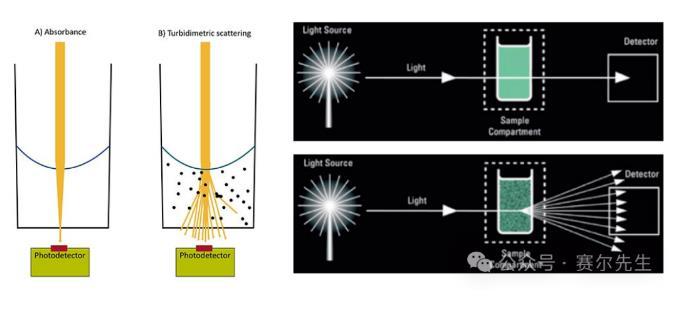 圖1:吸光度和濁度散射的基本區別,在吸光度測定中,由于光被樣品吸收,光電探測器中的光強會減弱(A);在濁度測定中,入射光由樣本中的細胞/粒子隨機產生散射。這將導致方向的不確定性。繼續沿直線傳播的光會進入檢測器,光強也會減弱(B)