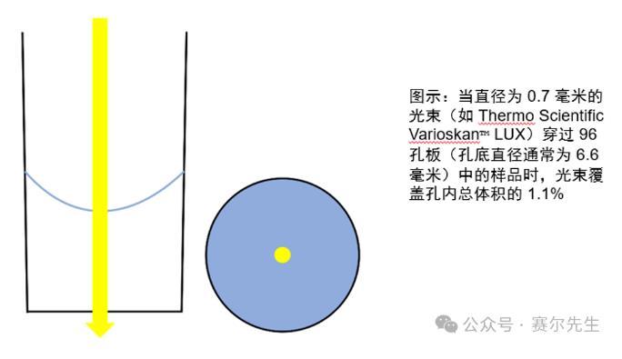 濁度測量總是在異質樣品中進行,一般需要測量96/384孔板,現在多數酶標儀通常使用相當窄的測量光束。通常情況下,微孔板光度計的光束直徑不到一毫米,當光束穿過96孔板的孔時,測量光束只能覆蓋樣品體積的很小一部分(圖2)。另外,現代微孔板光度計的采樣時間也很短,通常為毫秒級,這些對于濁度測量來說并不是最佳選擇會增加變化。比如液體中的固體顆粒并非處于靜止狀態,而是在整個液體中自由漂浮。因此,當樣品中只有少量固體顆粒時,在重復測量中,相同數量的顆粒出現在光束內的概率很低。如果樣品中有100個顆粒,那么測量光束區域內的顆粒數最有可能是1個,但隨機情況下可能是0個或2個,甚至3個。當采樣時間也以毫秒為單位時,液體中顆粒的動態流動不會明顯改變單個測量中的這種情況。因此,當OD值較低時,檢測精度可能會明顯降低,吸光度檢測的CVs%也會大于正常值。