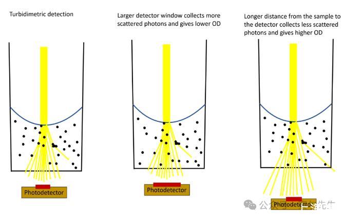 吸光度和濁度測量之間第二個非常重要的區別是,不同儀器的光學設計會影響所得到的OD值(圖3)。因此,不同廠家生產的微孔板光度計沒法對同一樣品給出相同的OD值。這里有兩個影響因素:一是光電探測器收集窗口的大小,二是收集狹縫的大小。探測器窗口越大,收集到的輕微散射光子就越多,因此觀測到的OD值就越低。還有一個主要問題是樣品到檢測器的距離。如果檢測器距離樣品很遠,即使是輕微散射光子也會到達檢測器;如果很近,即使是強烈散射光子也會被檢測器收集到。因此,這個距離對得出的OD值影響也很大。由于每個制造商的光學設計不同,這兩個參數(距離和探測器的大小)在兩臺不同的儀器中永遠不會相同。這些因素不會影響吸收測定,因為在吸收測定中光束形狀保持不變。檢測器的大小或距離不會改變到達檢測器的光量。