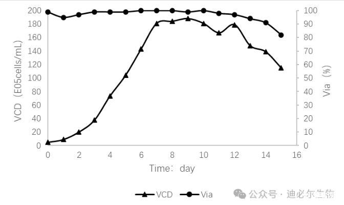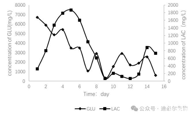 本次實驗中,培養周期內細胞的生長曲線及活率變化曲線如圖1所示。培養過程中細胞前期快速生長,最高細胞密度達1.88×107cells/mL,同時細胞活率維持在95%-100%之間,至第15天結束批次時細胞活率降至82%。葡萄糖及乳酸代謝曲線如圖2所示,在培養過程中葡萄糖快速消耗,乳酸先累積再消耗。