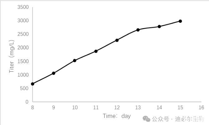 抗體表達量是抗體工藝中的關鍵目標參數之一,對于抗體工藝的建立與優化具有重要指導作用。在實驗進行至第8天時,進行蛋白表達量的相關檢測,并記錄表達量(圖3)。第8天至第15天,抗體產量逐漸增加,在第15天時表達量達到2.98g/L,表明在一次性細胞罐Endura SUB®3L中CHO-K1細胞同樣能夠正常完成相關抗體蛋白的合成。