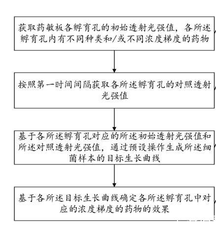 由于本例是將細(xì)菌樣本和培養(yǎng)基接種于藥敏板的多個孵育孔,各孵育孔內(nèi)有不同種類和不同濃度梯度的藥物,然后基于各所述孵育孔對應(yīng)的初始透射光強(qiáng)值和對照透射光強(qiáng)值,通過預(yù)設(shè)操作生成細(xì)菌樣本的目標(biāo)生長曲線,最后基于各目標(biāo)生長曲線確定各孵育孔中對應(yīng)的濃度梯度的藥物的效果,相比于現(xiàn)有技術(shù),本實施例實現(xiàn)了從原理上消除了過多干擾因素,有效提高了藥敏檢測的準(zhǔn)確性。