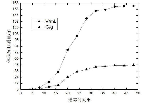 如圖中所示,V/mL曲線為利用本裝置測量的生長曲線,G/g曲線為利用常規的離心稱重法測的生長曲線。從V/mL曲線中,可以看出約在12h之前為延滯期,12h后米曲霉開始較快速生長,12~32小時為對數生長期,在32h左右進入穩定期。這一結論基本也可以從G/g曲線中得出,從而驗證本裝置測量方法的有效性以及科學性。