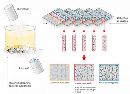 ● 通過專門的嵌入式圖像分析算法能夠檢測單個細胞,定量分析微生物濃度低至約103cfu/ml的生長。