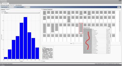 用成像軟件進行形態學分析,柱狀圖顯示了用1μM頭孢他啶培養的銅綠假單胞菌在細胞群中細胞伸長的分布。右側列出單個單元格和子單元格,并用ID號標記。對于每一個,都列出了所有的定量參數。