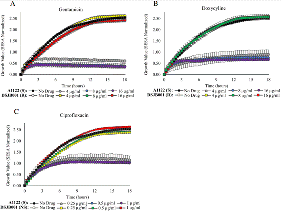 在慶大霉素GEN(圖1a)、多西環素DOX(圖1b)和環丙沙星CIP(圖1c)存在和不存在的情況下,對鼠疫桿菌菌株在18小時內的細菌生長情況進行了實時檢測。在低于MIC的所有測試藥物濃度下,oCelloScope光學篩選都能觀察到生長。生長動力學實驗還表明,在所有測試的藥物濃度存在下,A1122的生長抑制作用,并且在這些條件下,DSJB001和A1122之間的生長差異可以在最初的三到六個小時內觀察到。