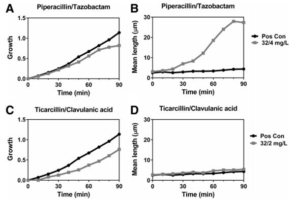 對于濃度為8μg/mL(紅線)的細菌和生長在普通培養基(藍線)中的陽性對照,對細菌生長動力學(實線)和絲狀(虛線)進行了區分。使用SESA監測生長動力學算法,細菌長度的變化采用分段提取平均長度(SEAL)算法進行測量。