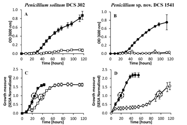圖1,C和D,兩株青霉菌DCS302和DCS1541在有無丙酸的條件下,使用oCelloScope方法測量生長曲線。不含丙酸時(黑色實心)大約15小時內兩株青霉菌都檢測到了生長。添加0.5mg/mL丙酸后(白色空心),DCS302在20小時后監測到了生長,DCS1541在60小時后監測到了生長。