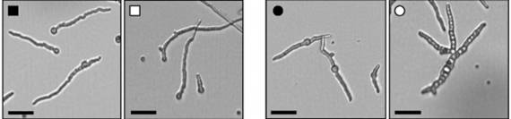 黑色實心圖不存在丙酸,空心圖存在丙酸。左邊兩圖為DCS302青霉菌形態的變化。右邊兩圖為DCS1541青霉菌形態變化。丙酸引起了DCS1541青霉菌菌絲不規則生長和膨脹,DCS 302對丙酸更耐受,對形態沒有顯著影響。