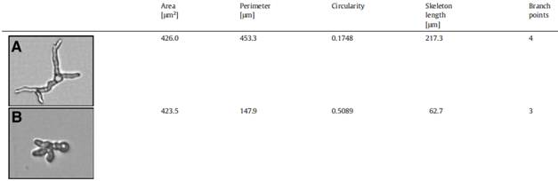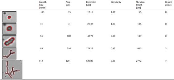 整個測量過程未擾動樣品生長的菌絲和形態,同時還可以跟蹤單個孢子的發育,測量孢子的萌芽時間、面積、周長、圓度、分枝點、骨架長度以及菌絲的周長和面積。