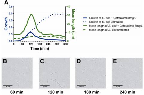 用頭孢噻肟(8mg/L)處理大腸桿菌,oCelloScope系統觀察抗生素誘導的絲狀體成絲過程,測量哌拉西林對大腸桿菌生長和長度的影響。a通過兩種不同的算法(SEAL算法和SESA算法)測定未處理(點劃線)和頭孢噻肟處理(實線)的大腸桿菌的細菌生長動力學和成絲的定量:生長動力學(藍色圖表)基于表面區域的分割和提取,以及細菌長度(綠色圖)基于分割提取的平均長度。在時間b 60分鐘、c 120分鐘、d 180分鐘和E 240分鐘,通過oCelloScope系統獲得用8mg/L頭孢噻肟處理的大腸桿菌形態的圖像。