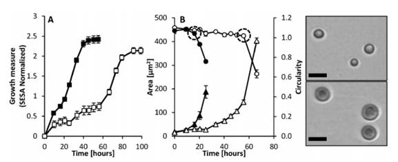 圖A表明存在(空心)和不存在(實心)二乙酰時,青霉菌DCS1066生長曲線的差異。圖B表明存在(空心)和不存在(實心)二乙酰時,青霉菌DCS 1066平均孢子面積(▲, Δ)和平均孢子圓形度(●,○)的差異。圖C為孢子剛萌發的狀態。
