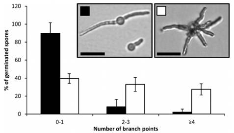 在和不存在二乙酰時,oCelloScope記錄發芽的青霉菌DCS 1066孢子中的分支點數量。在25和66小時,真菌大多數孢子已發芽。