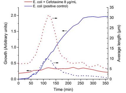 結果表明,用頭孢噻肟處理誘導產生絲狀體然后裂解細菌細胞,從而顯著增加了大腸桿菌菌株的長度。菌絲在約90分鐘達到峰值,平均細胞長度約為30μm(圖a,c)。與此一致,介電電泳檢測的頭孢唑林處理的大腸桿菌的β-內酰胺誘導的伸長在培養120分鐘后顯示細菌細胞長度的峰值。對抗生素耐藥性和敏感性大腸桿菌中細絲形成的檢查表明,細絲形成是接種2小時后對頭孢噻肟的初始反應。