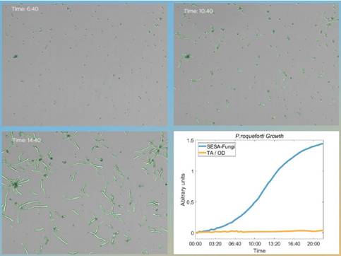 OCelloScope的?測量顯示,青霉菌的生長比OD測量結果要早得多。當使用OD值法在0.5mg/mL丙酸存在下評估真菌的生長時,我們看到兩株真菌都受到了抑制。然而,oCelloScope測量的生長曲線顯示,兩株真菌都在丙酸存在時生長,并沒有受到抑制。因此,oCelloScope圖像和SESA算法的使用大大提高了生長檢測的靈敏度和速度。