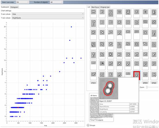 復雜樣品分析及形態鑒別:通過內置的劃分算法,用戶能夠自動執行單細胞分析,并在復雜樣本中區分和表征不同細胞類型的動力學。在散點圖和直方圖中,可以計算和可視化20多個形態特征,包括每個單個對象的細胞大小和形狀因子,使用戶能夠對所需對象進行分組,并分析所需組隨時間的形態變化。例如,可以在真菌或細菌產孢實驗中對營養細胞和孢子進行區分。